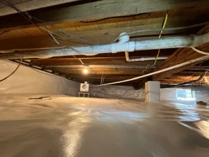 To complete the system, our team installed a sump pump to handle any water that might collect beneath the liner and added a high-efficiency dehumidifier to keep the air inside consistently dry. Together, these systems work around the clock to maintain ideal humidity levels and protect against future mold growth.